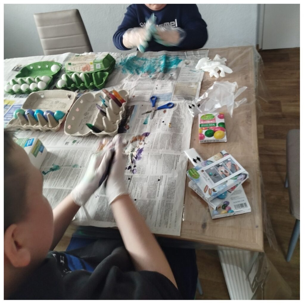 In unserer Tagesgruppe Plossig waren viele kleine Helferinnen und Helfer fleißig: Gemeinsam wurden Eier gefärbt, bemalt und liebevoll verziert. Aus einfachen Eiern wurden kleine Kunstwerke – mit vielen strahlenden Farben, stolzen Gesichtern und echter Frühlingsstimmung im Gruppenraum.
