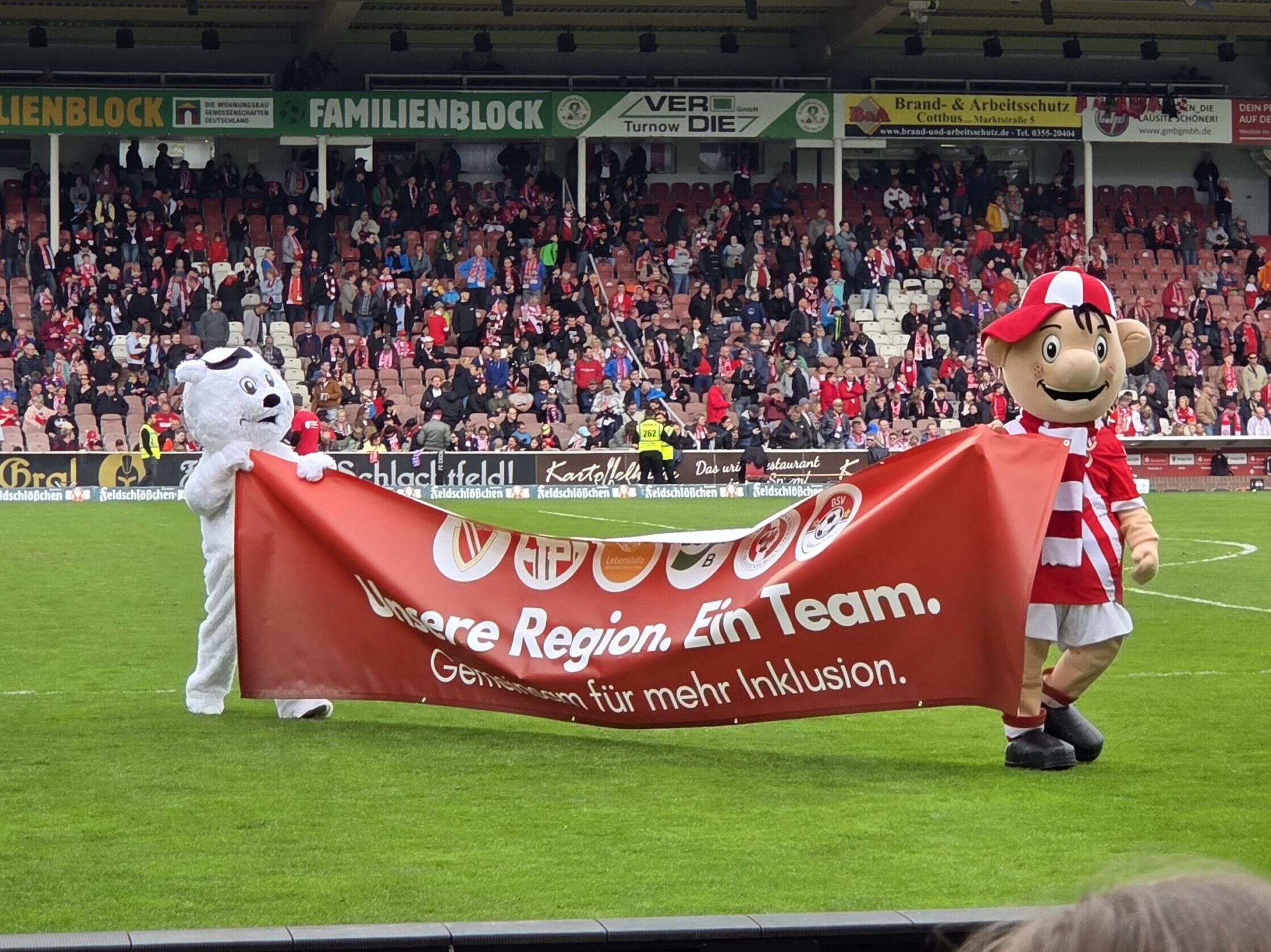 Zwei Kinder aus der Erdmännchen-Gruppe in Leibchel haben am Sonntag das Spiel von Energie Cottbus gegen Rot-Weiß Essen live im Stadion besucht.