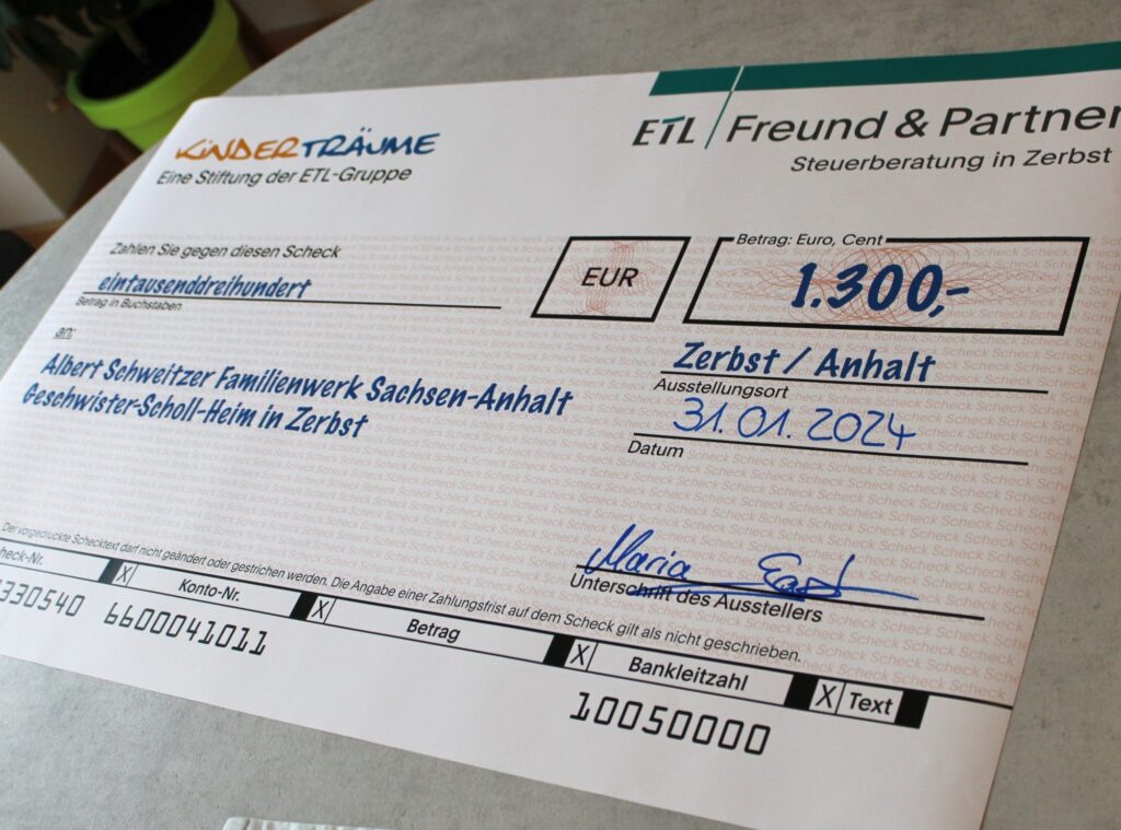 Am vergangenen Mittwoch durfte unser Einrichtungsleiter Herr Güth vom Geschwister-Scholl-Heim einen besonderen Moment erleben – die Scheckübergabe von 1.300,00 Euro, die uns von Maria Gast und Julia Recker von ETL Freund & Partner, Steuerberatungsgesellschaft in Dessau und Zerbst großzügig überreicht wurde. In einer herzlichen Atmosphäre wurde der symbolische Scheck übergeben.