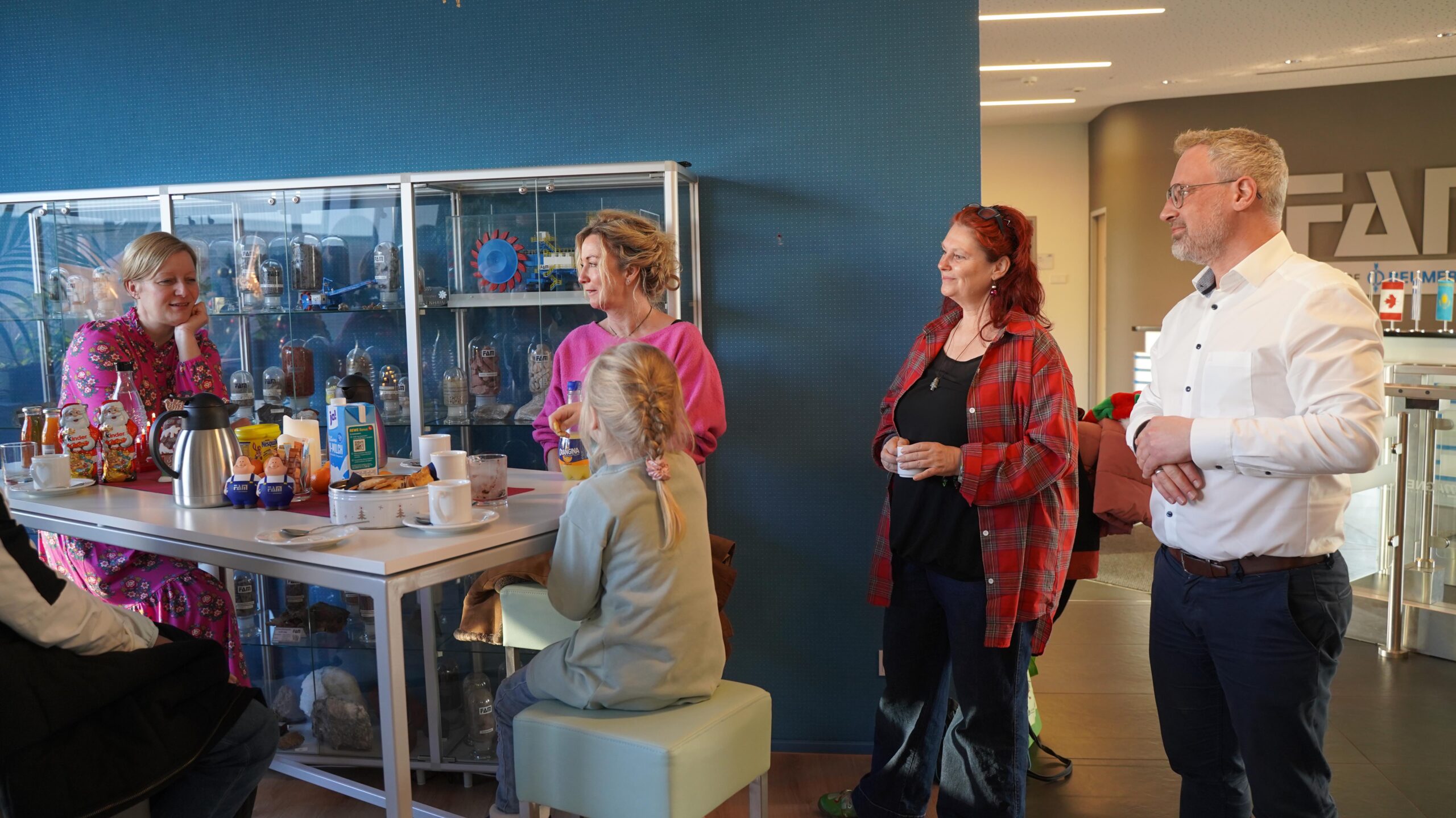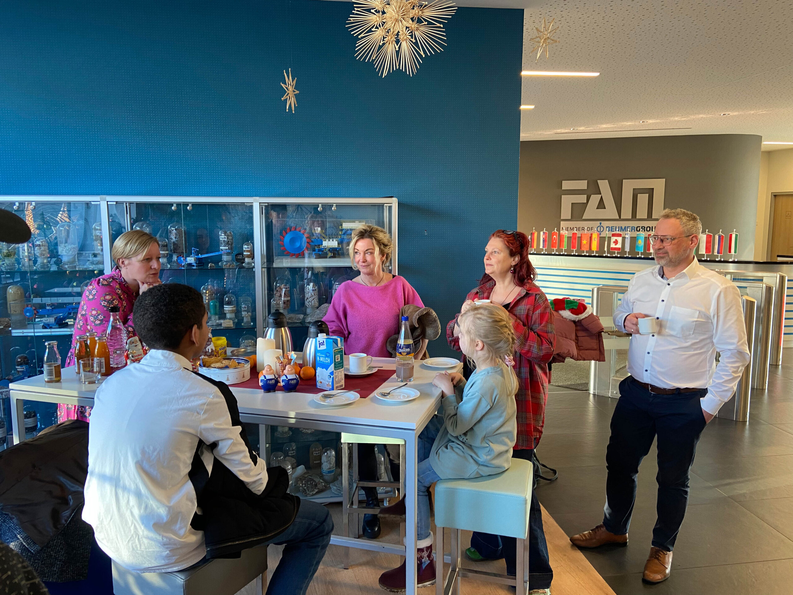 Zur feierlichen Übergabe der Präsente trafen sich unser Geschäftsführer, unsere Kinderdorfmutter mit Geschäftsführer und Vertreter des Managements von FAM Minerals and Mining GmbH sowie zwei Kinder aus unseren Einrichtungen. Die beiden Kinder waren stellvertretend für alle anderen Kinder und Jugendlichen vor Ort und nahmen die Geschenke symbolisch entgegen. In einer warmen und herzlichen Atmosphäre – bei Kaffee, Kakao und Plätzchen – wurden die Geschenke persönlich überreicht. Es entstanden viele berührende Gespräche, in denen deutlich wurde, wie wichtig Solidarität und gesellschaftliches Engagement für unsere Arbeit sind.
