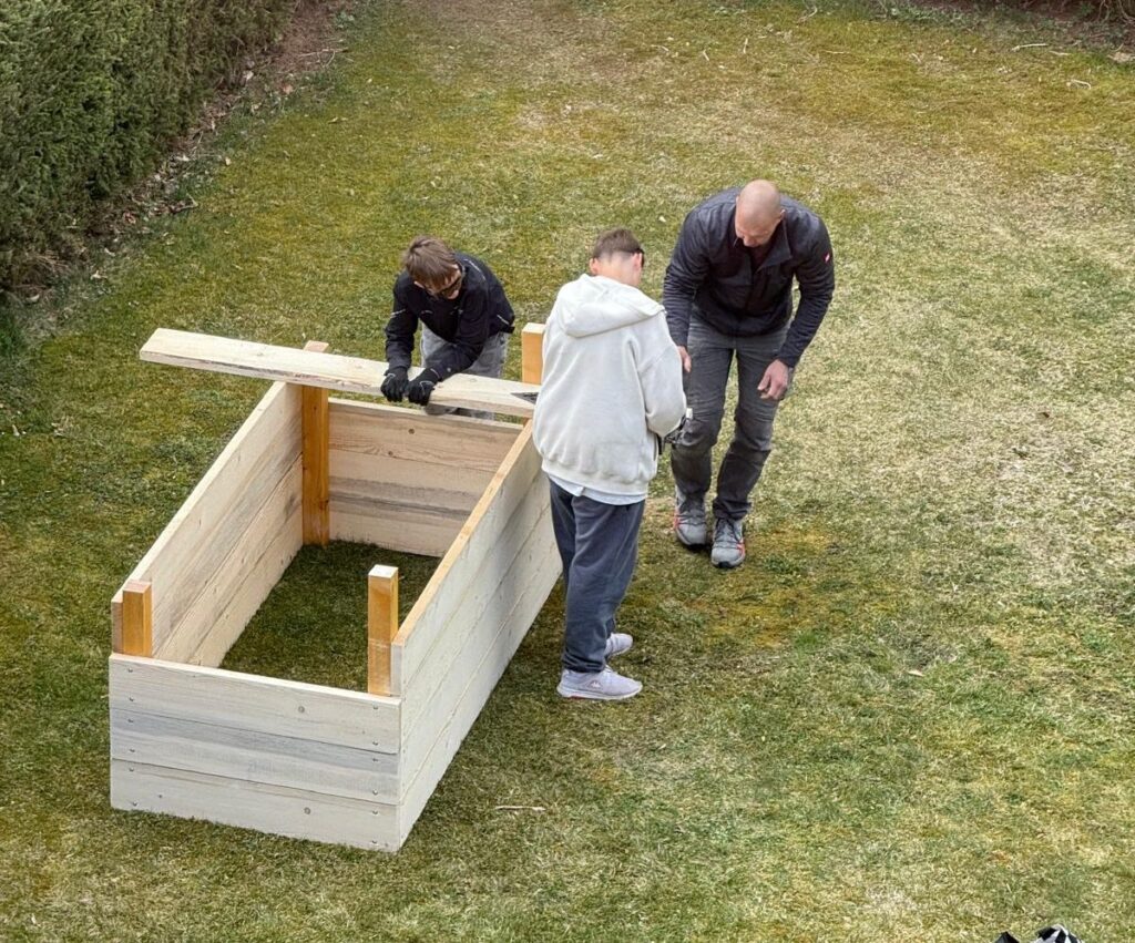 Wie auf den Fotos zu sehen ist, sind zwei Jugendliche mit Begeisterung dabei, unserem Hausmeister beim Bau von einem Hochbeet zu helfen.