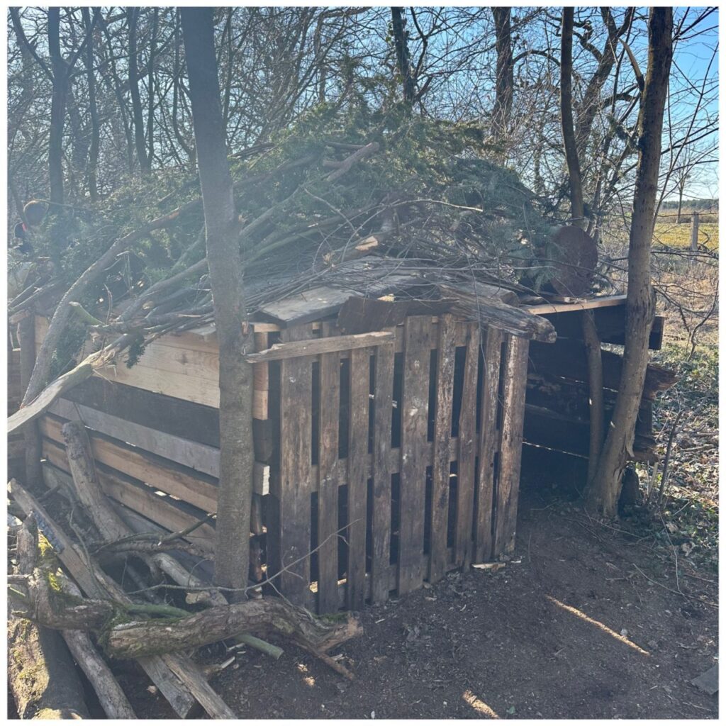 Ausgestattet mit viel Kreativität und Teamgeist machten sie sich auf den Weg, um passende Naturmaterialien zu sammeln. Äste, kleine Stämme, Bretter und Holzstücke wurden eigenständig zusammengetragen –alles, was man für ein richtiges Versteck im Grünen braucht. Schritt für Schritt entstand so eine gemütliche, selbstgebaute Butze, in der gespielt und gemeinsam gelacht werden kann.
