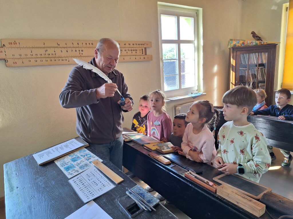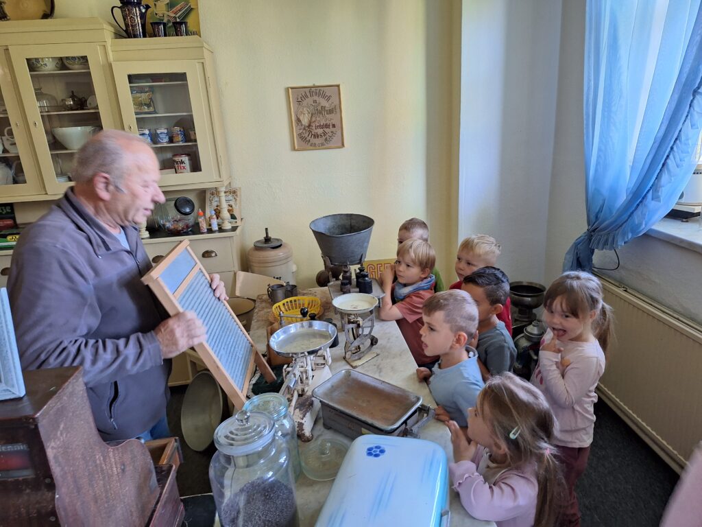 Ein besonderes Highlight war der Besuch der Heimatstube in Steutz. Dort konnten die Kinder alte Möbel, Kleidung, einen historischen Klassenraum und einen Verkaufsladen von früher entdecken. Mit großer Freude verkleideten sie sich und durften sogar selbst Verkäufer spielen.