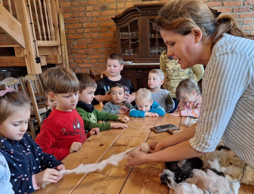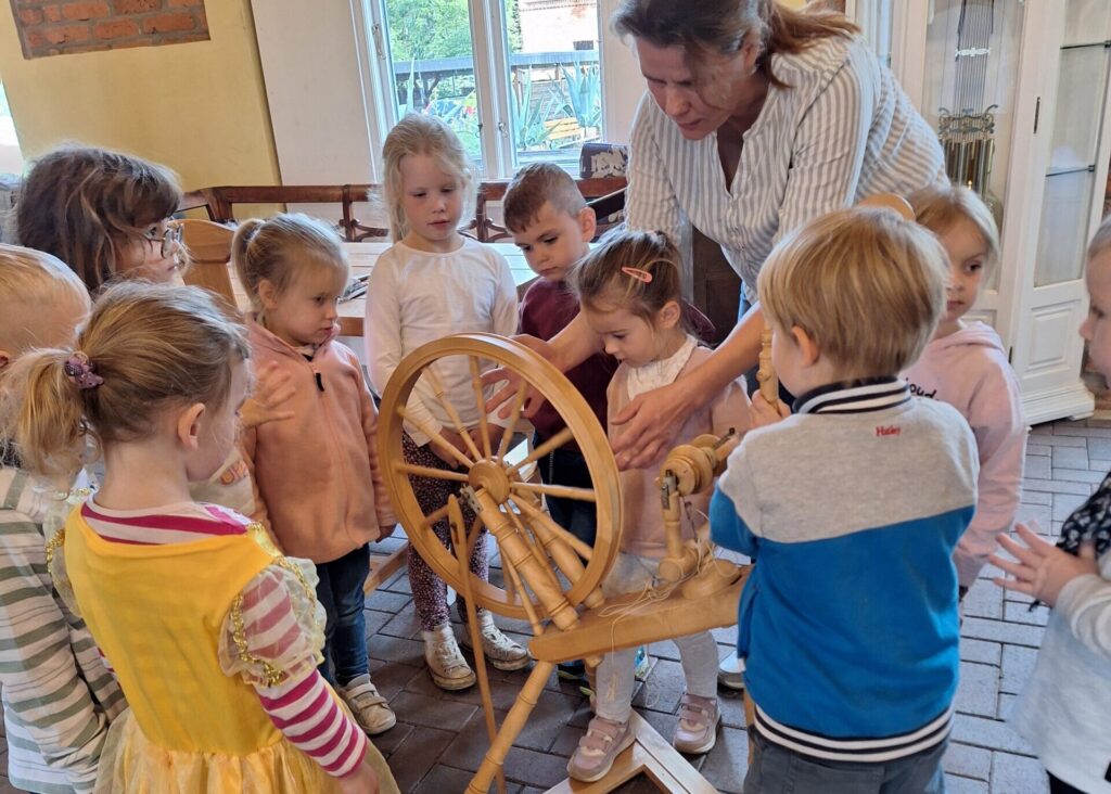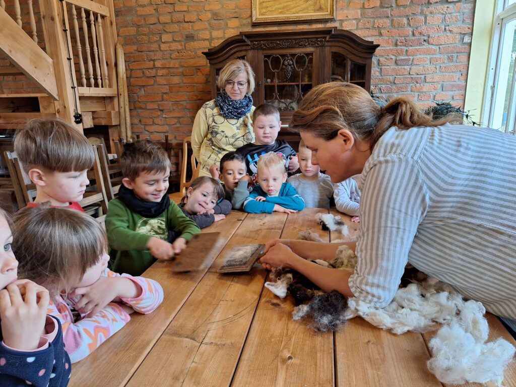 Ein weiterer Ausflug führte die Jungen und Mädchen zur Domäne nach Kermen. Hier erfuhren die Kinder auf anschauliche Weise, woher die Wolle kommt und wie sie verarbeitet wird. Mit einer Kardierbürste reinigten sie echte Schafswolle und bereiteten sie zum Spinnen vor. Ein Spinnrad live zu erleben war für viele ein echtes Abenteuer.