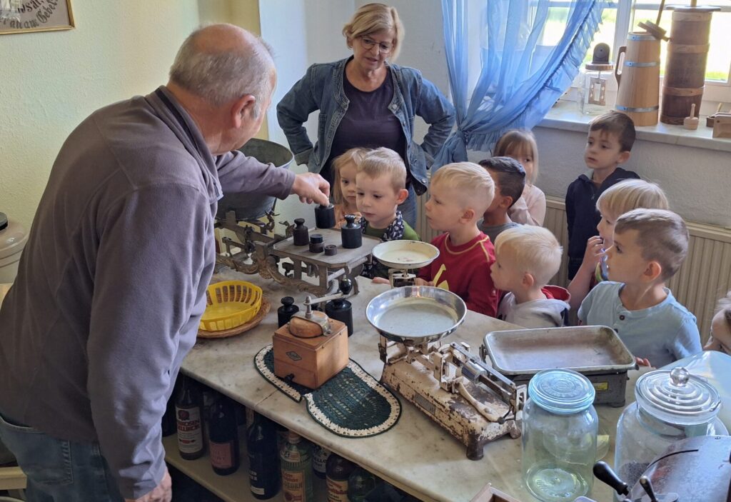 Ein besonderes Highlight war der Besuch der Heimatstube in Steutz. Dort konnten die Kinder alte Möbel, Kleidung, einen historischen Klassenraum und einen Verkaufsladen von früher entdecken. Mit großer Freude verkleideten sie sich und durften sogar selbst Verkäufer spielen.